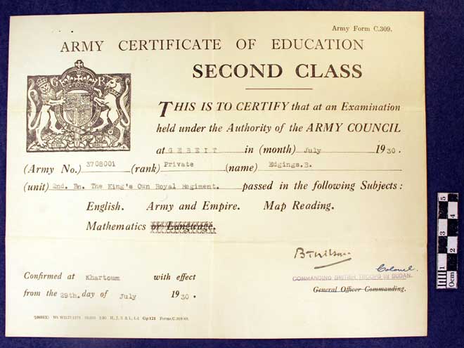 Army Form C 309, Second Class Army Certificate of Education to Private