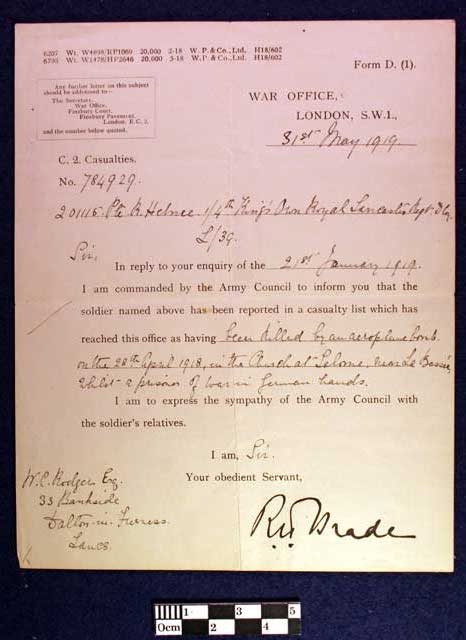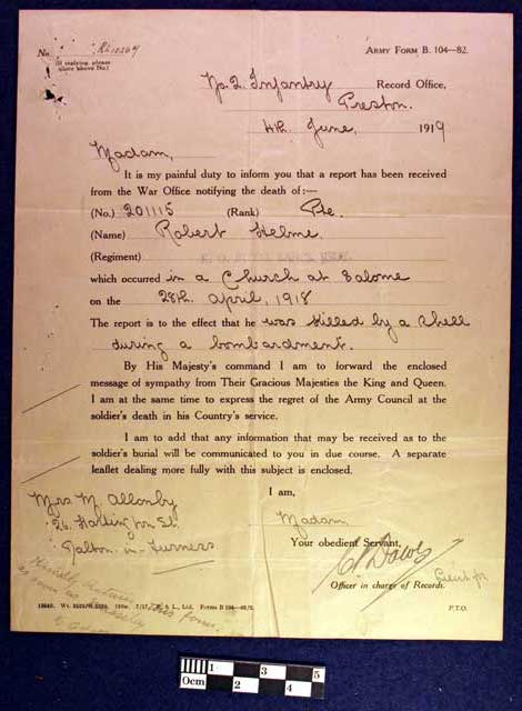 Street, Dalton in Furness relating to Private Robert Helme, 1st/4th
