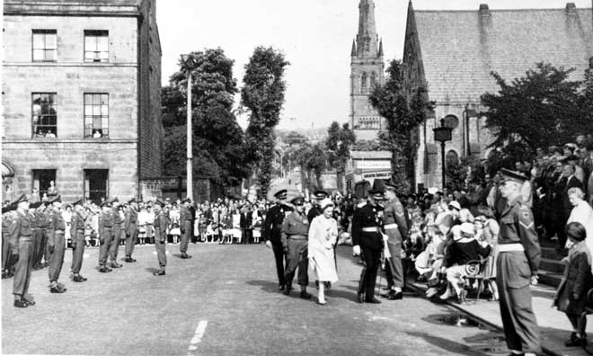 Queen Elizabeth, outside Lancaster Town Hall, with Major Todd. Royal