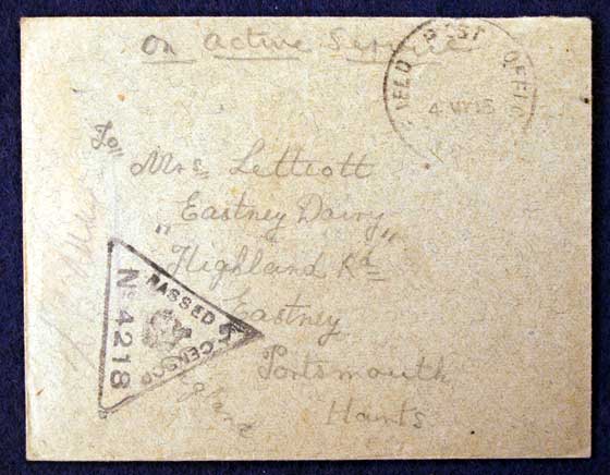 Portsmouth, Hampshire. Postmarked 4 May 1915 and passed by Field Censor.