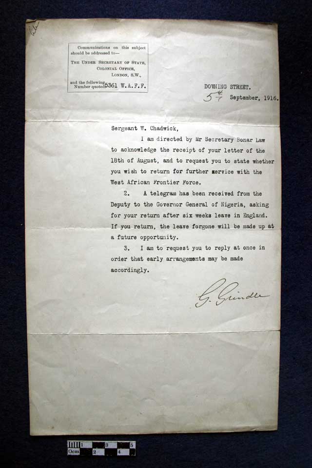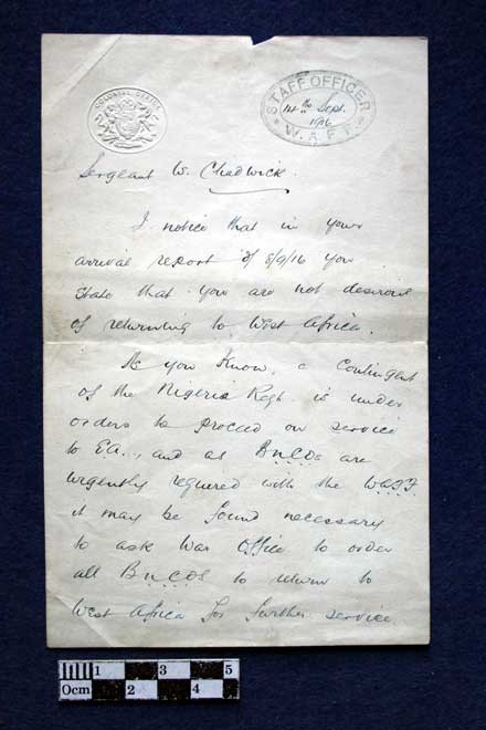 Letter to Sergeant William Chadwick, from Staff Office, West African