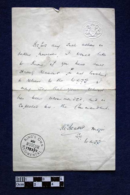 Letter to Sergeant William Chadwick, number 5238, King’s Own from the