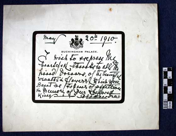 Duplicated card from Buckingham Palace, 20 May 1910, thanking those who