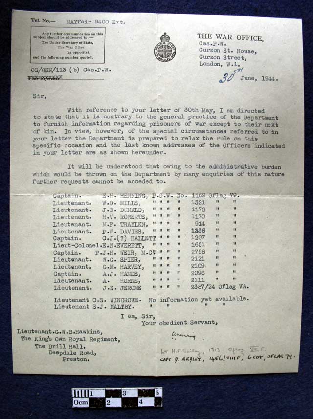 Letter from The War Office, (Casualty Prisoners of War) to Lieutenant
