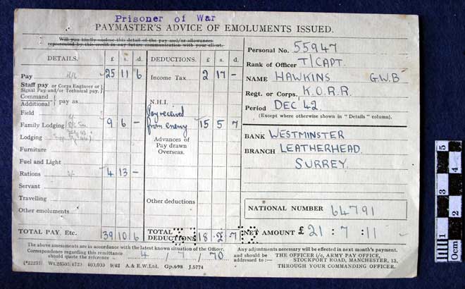 dated Dec 1942 for Acting Captain G W B Hawkins, King’s Own Royal