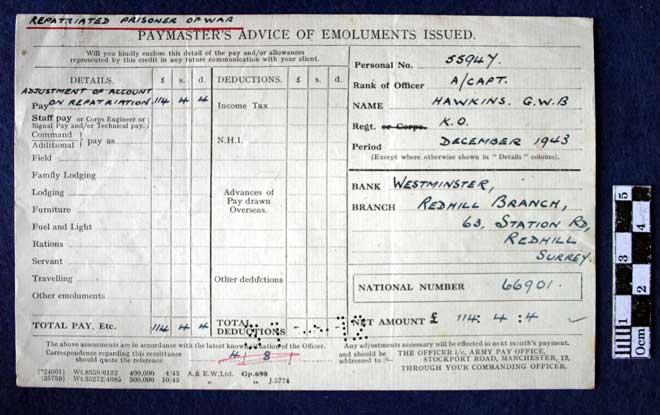 Repatriated Prisoner of War Paymaster’s Advice of Emoluments issued,