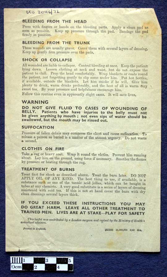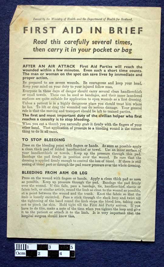 Collections - Archives Second World War - The Home Front Leaflet: First Aid in Brief. First Aid in Brief. Issued by the Ministry of Health and the Department of Health for Scotland. June 1940.