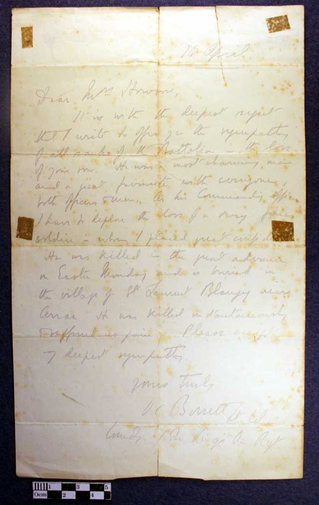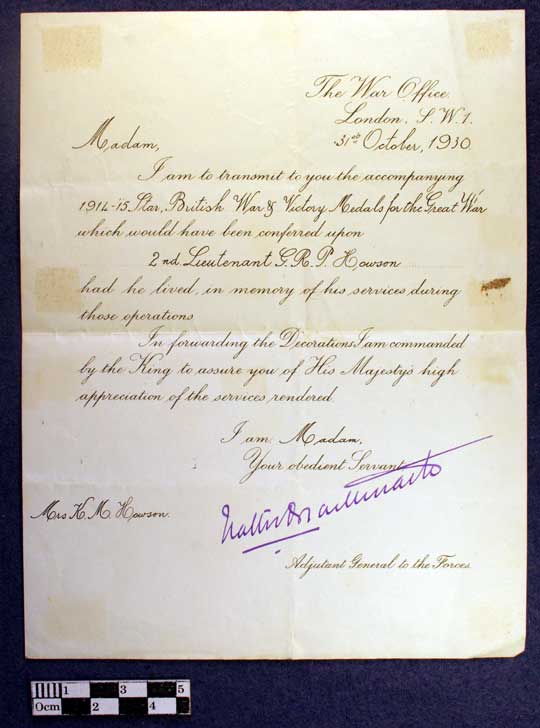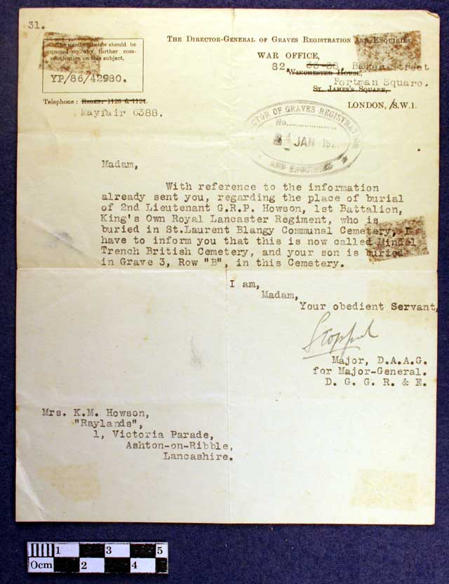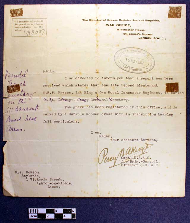 Shortly after his death a local newspaper reported the following: "Death in action on Easter Monday while leading his platoon, youngest son of the late Mr R G Howson one of the founders of the Morecambe Music Festival and many years manager of the Lancaster Bank, Morecambe. Deceased joined the service of the London City and Midland Bank, and had been for some years one of the clerks in the Carnforth Branch and prior to that was in the Kirkby Lonsdale Branch." Another newspaper reported: Second Lieutenant R P H Howson - Killed Information has come to hand that 2nd Lieutenant George Rowland Paget Howson, King's Own Royal Lancaster Regiment, and younger son of the late Mr R G W Howson, one of the founders of the Morecambe Musical Festival, and for many years the manager of the Morecambe Branch of the Lancaster Banking Company, now the Manchester and Liverpool District Banking Company. Howson, of Bare, was killed in action on Easter Monday, whilst leading his platoon in the attack. The deceased officer, who was 32 years of age, was educated at the Lancaster Royal Grammar School, served on the staff of the Manchester and Liverpool District Bank at Kirkby Lonsdale, and later for some years at Carnforth. In his school days he was conspicuous in games, and later maintained his keenness for both cricket and football. He enlisted in the Royal Fusiliers, with whom he served for a time in France, returning for a course of training with the Oxford Officer Training Corps and subsequently given a commission in the King's Own Royal Lancaster Regiment. An officer colleague, in notifying his death, writes:- "It is with the deepest sorrow that I have to tell you of the death of your gallant son, which took place on Easter Monday, when he was leading a platoon in the attack. It may be some consolation for you to know that your son's death was absolutely instantaneous. He was a gallant gentleman, and greatly loved by all his men. I have had the pleasure of his friendship ever since he joined, and I assure you we appreciated him very much. I assure you we all sorrow with you in this great blow. Yours sincerely, A P Myers." Deceased's elder brother, Harold, also in the service of the Manchester and Liverpool District Banking Company at Lancaster, responded to the country's call a few months ago.