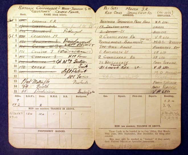 Collections - Archives Second World War - The Home Guard Home Guard Record Card Home Guard Record Card for 'A' Company 2nd Battalion, County of Lancaster Regiment Home Guard, including list of members, addresses and employers.