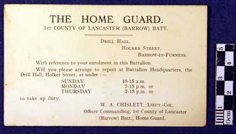 Collections - Archives Second World War - The Home Guard Home Guard - Notice of Enrolment Postcard regarding enrolment in Home Guard - 1st County of Lancaster Barrow Battalion