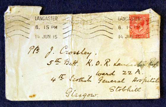 Envelope postmarked 14 Jun 1915 to Private John Crossley in 4th Scottish