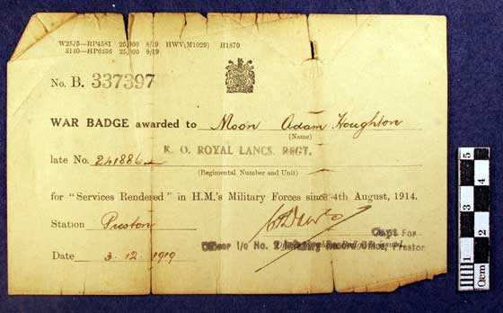 Silver War Badge number B337397 to Private Adam Houghton Moon, number