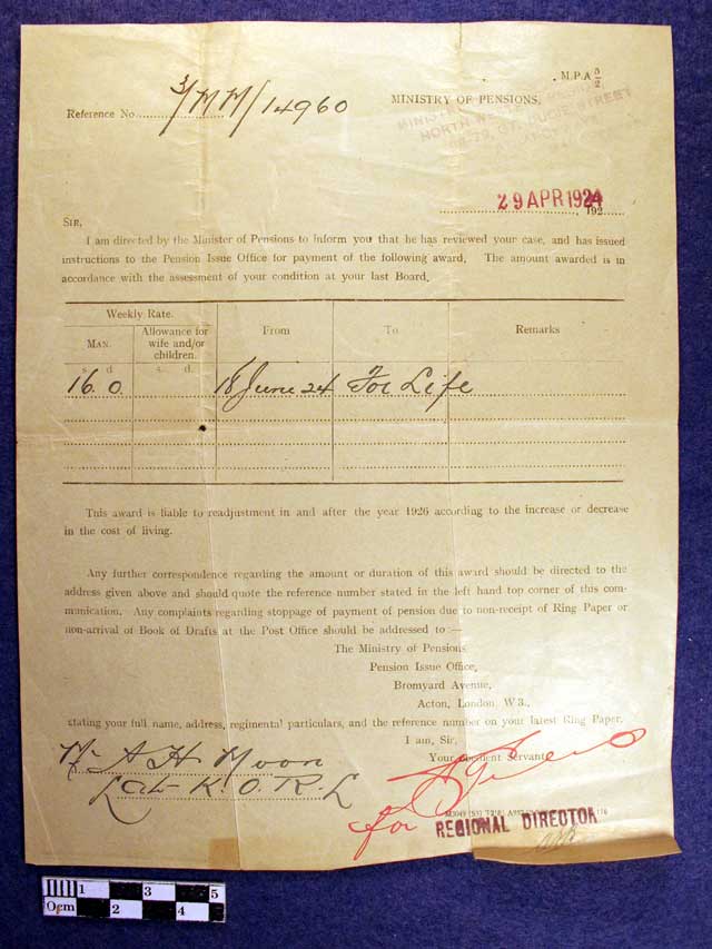 Official letter, dated 29 Apr 1924 from the ministry of Pensions
