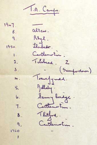 Hand written list of Territorial Army Camps, 5th Battalion, King’s Own
