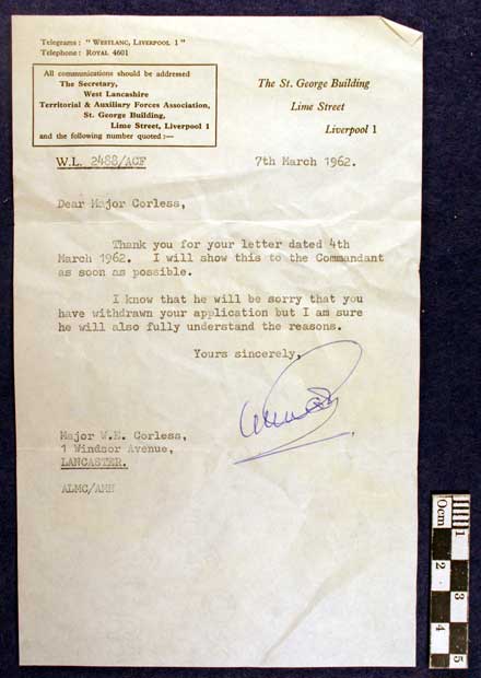 Letter to Major William Edward Corless re withdrawal of application. 7