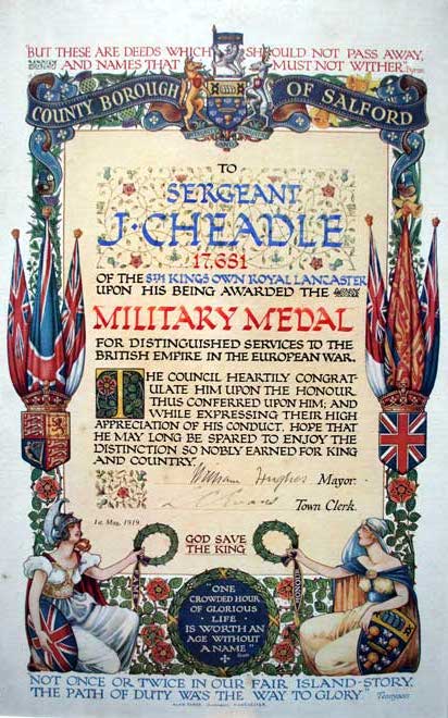 Collections - Archives - First World War Borough of Salford Certificate - Sergeant John Cheadle The County Borough of Salford gave a special certificate to Sergeant John Cheadle, number 17681, of the 8th Battalion, King's Own Royal Lancaster Regiment, to mark the award of the Military Medal for gallantry. The certificate is dated 1st May 1919 and is a printed document by Alan Taylor, Illuminator of Manchester, with the personal details added. Sergeant Cheadle was wounded at Ypres in 1918 and had a leg amputated in February 1945 as a result of the wounds. He died on 30th November 1981.