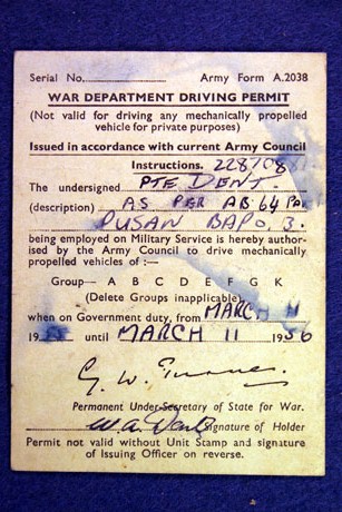 War Department Driving Permit (Army Form A.2038) issued to Private