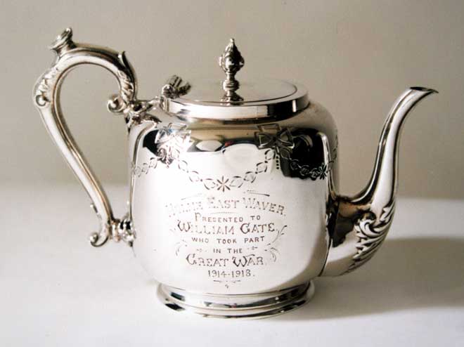 Soldiers of the Regiment Private William Gate Private William Gate, number 32522, served with the King's Own Royal Lancaster Regiment and later with the North Staffordshire Regiment as number 41673, in the First World War and was presented with this silver teapot by his home village on this return.