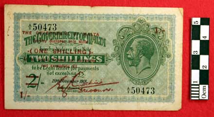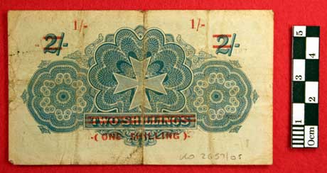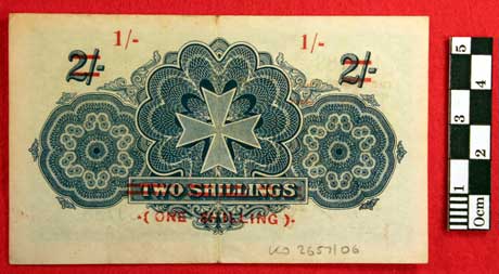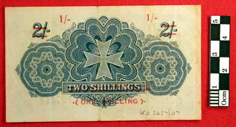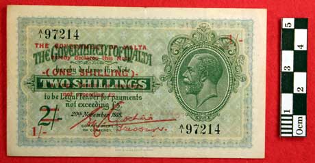 The Government of Malta Two Shilling note cancelled to be a One Shilling