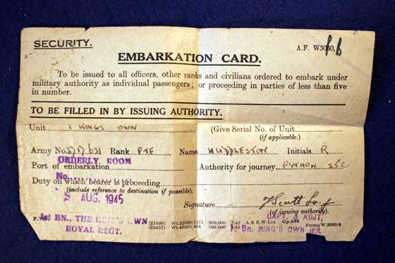 Photo of Embarkation Card to Private Huddleston, Aug 1945
