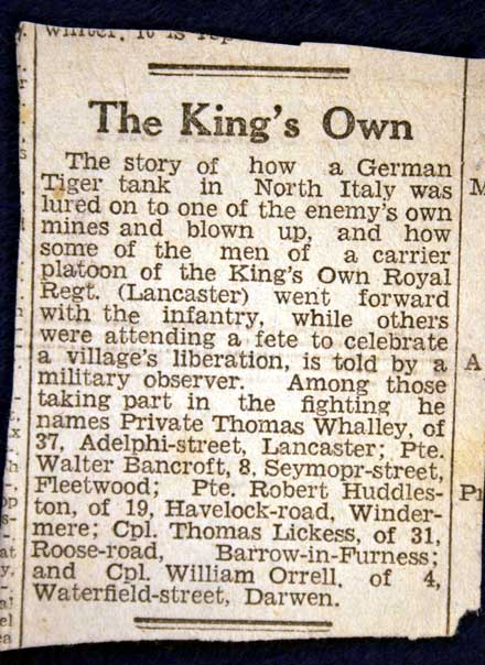 Newspaper cutting, telling the story how 1 King’s Own was involved in