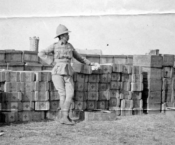 Lieutenant Colonel J M Gawne, stood next to boxed rations