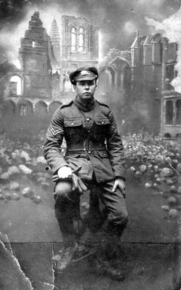 Lancaster Regiment, studio portrait photograph, with backdrop of ruins