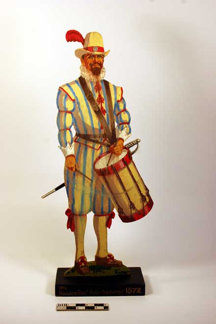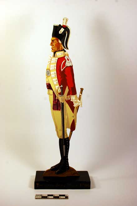 In May 1929 he wrote to the Curator of Lancaster Museum on hearing the news of the establishment of the King's Own Museum. He wrote "I am an invalided ex officer (retired) and have now taken up my former hobby of painting etc to support myself and family. I am specialising in sketches etc of past and present uniforms of the British Army." The sample figure, shown left, is 11 inches high and cost 6 shillings and 6 pence each. Figures were also available at 2, 3, 4, 5 and 6 feet high. (25, 35, 50, 70 shillings and £5 5 shillings respectively). "The wooden figures in my opinion" he wrote "make the more interesting exhibits for museum purposes, the two foot and three foot sizes being most suitable. They are large enough to shew the small details which are often so important in uniforms. Lieutenant Howell had already provided figures to the Royal Scots Regiment, Royal Scots Fusiliers, The Rifle Brigade, The Worcester Regiment and The Border Regiment. The King's Own Museum never took up the opportunity to obtain a set of figures to illustrate the sartorial history of the regiment, all that survives in the sample figure.