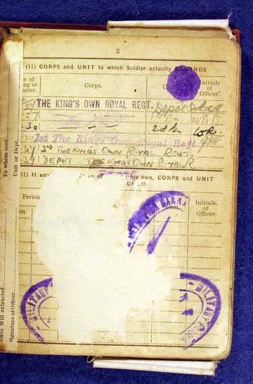 number 3708452, Depot, King’s Own Royal Regiment. Aug 1927.