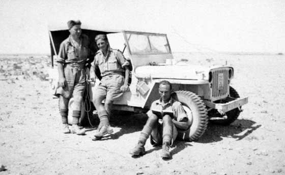 Three soldiers in desert with Jeep, World War Two, possibly Western
