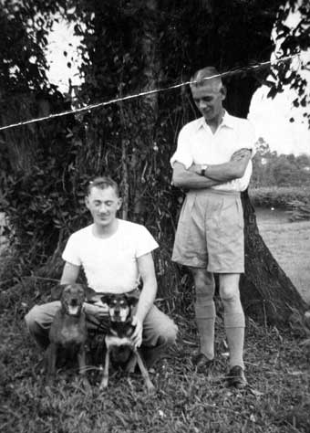 Circa 1947/48. “Outside the main gate” Soldiers with dog.