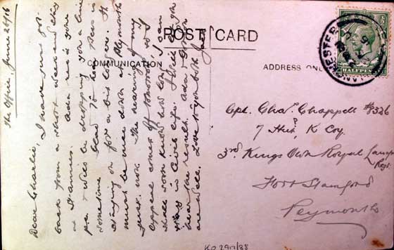 Soldiers of the Regiment Sergeant Charles Chappell Corporal Charles Chappell, number 8326, was in 7 Hut, K Company, 3rd Battalion, King’s Own Royal Lancaster Regiment, Fort Stamford, Plymouth, when this post card was sent to him in June 1916. Corporal Chappell arrived on the Western Front on 27th August 1914 and joined the 1st Battalion who had already been there for only a few days. He received the 1914 Star as well as the British War and Allied Victory Medals. He finished the war with the rank of sergeant.