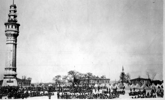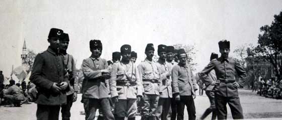 Royal Field Artillery assembling outside barracks on X Day, Bosphorus in