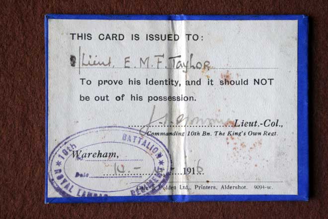 Soldiers of the Regiment Lieutenant Edward Melville Forbes-Taylor The museum has recently acquired by purchase three photograph and scrap albums of Lieutenant Forbes-Taylor who served with the 6th and 10th Battalions of the King's Own, and later the 84th Punjabi Regiment in the First World War. Medals: 1914/15 Star British War Medal Allied Victory Medal Defence Medal Albums: