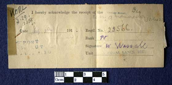 Receipt for Allied Victory Medal to Private William Wassall, number