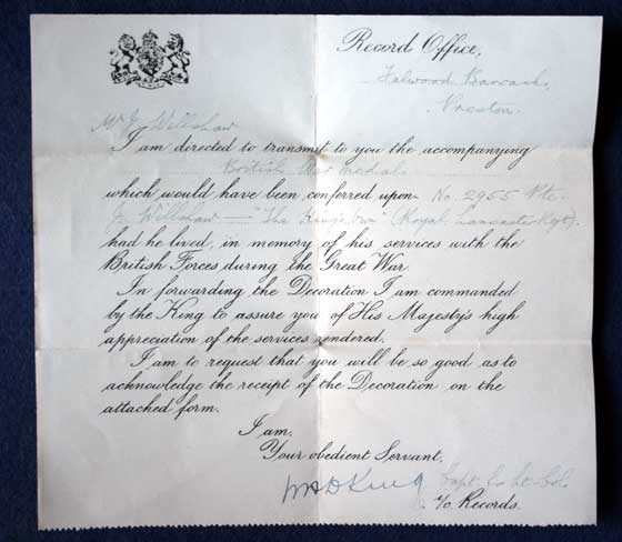 Soldiers of the Regiment Private John Willshaw Private John Willshaw, number 2955, of the 1st/4th Battalion, King's Own Royal Lancaster Regiment went across to the Western Front on 3rd May 1915 with the rest of the battalion. He was killed in action on 15th June 1915 and having no known grave is commemorated on Le Touret Memorial. His brother, Private Joseph Willshaw, number 19518, of the 11th Battalion, Border Regiment was killed in action on 1st July 1916 and is buried in Lonsdale Cemetery. They had two uncles who served and died with the King's Own: Private John Cavin Willshaw, number 14476, of the 8th Battalion, King's Own Royal Lancaster Regiment was killed in action on 1st October 1918. Home address: 14 Holly Terrace. Private Robert Charles Willshaw, number 201217, of the 1st/4th Battalion, King's Own Royal Lancaster Regiment died of wounds on 7th August 1917 and is buried in St. Mary's Windermere. Home address: 14 Holly Terrace, Windermere.