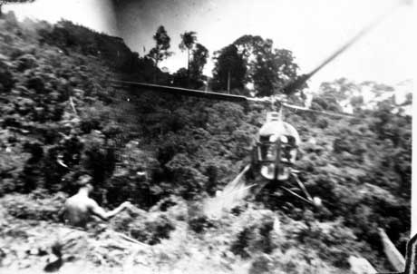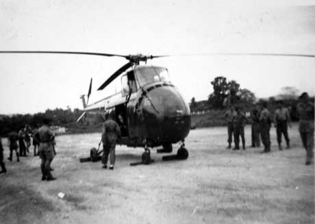 Soldiers and helicopter in jungle.