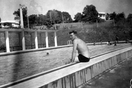 Soldiers in outdoor swimming pool