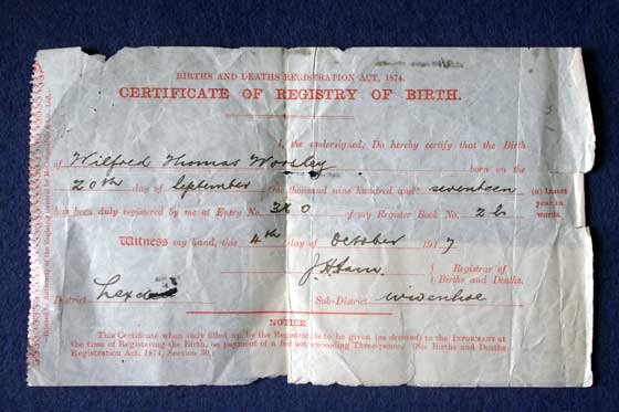 Certificate of Registry of Birth, Wilfred Thomas Worsley, Born 20 Sep