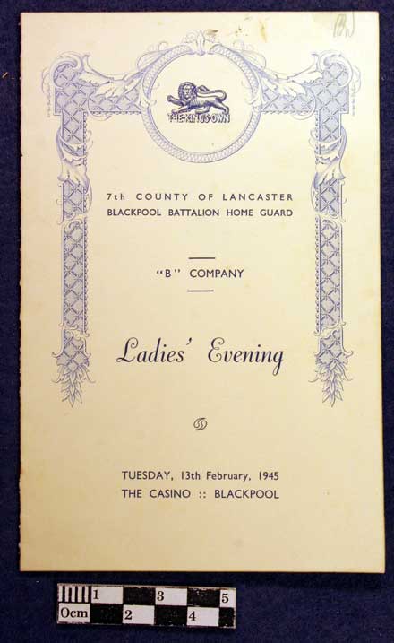 Collections - Archives Second World War - The Home Guard Home Guard - Programme for Ladies' Evening, 7th County of Lancaster Battalion, 1945. Programme for 7th County of Lancaster (Blackpool) Battalion Home Guard, 'B' Company, Ladies' Evening, Tuesday 13th February 1945 to be held at The Casino, Blackpool.