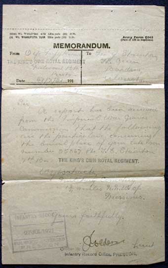 Soldiers of the Regiment Private Thomas Edward Stainton Private Thomas Edward Stainton, number 25367, of the 7th Battalion, King's Own Royal Lancaster Regiment.