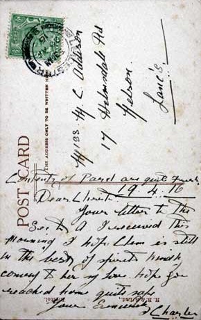 Postcard sent to Miss Christy Addison, from soldiers, First World War.