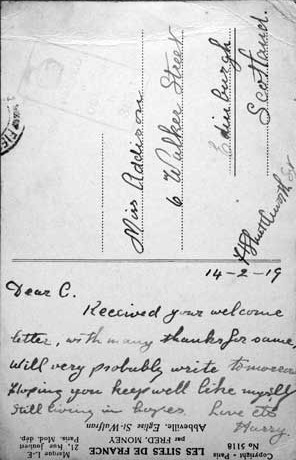 20 Feb 1919. From Sergeant H Shuttleworth