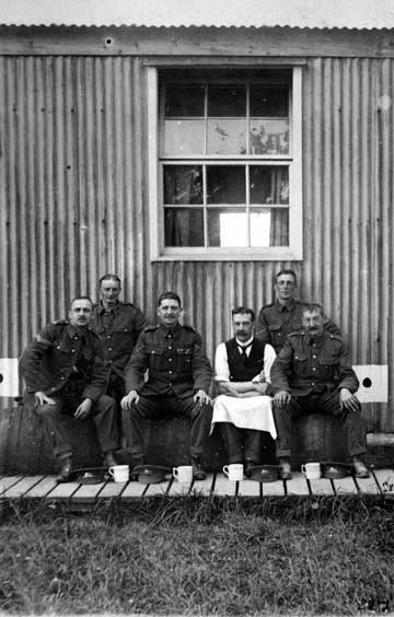 Group of six soldiers (only five in uniform) taking a tea break.