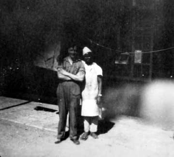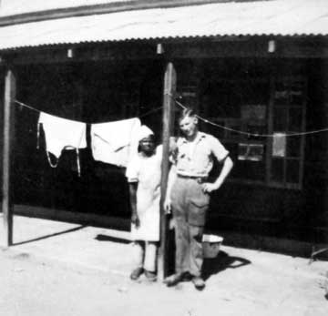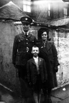 Royal Air Force man, with lady and child, photographed at rear of house,