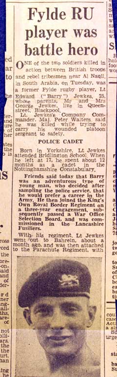 Obituary Notice in Newspaper Lieutenant Barry Jewkes, King’s Own Royal