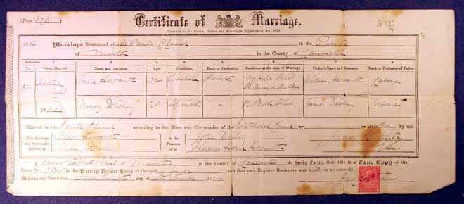 Marriage Certificate, Fred Howarth and Mary Disley, married at St.