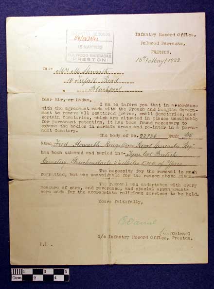 Letter dated 15 May 1922 from the Infantry Records Office, Preston, to