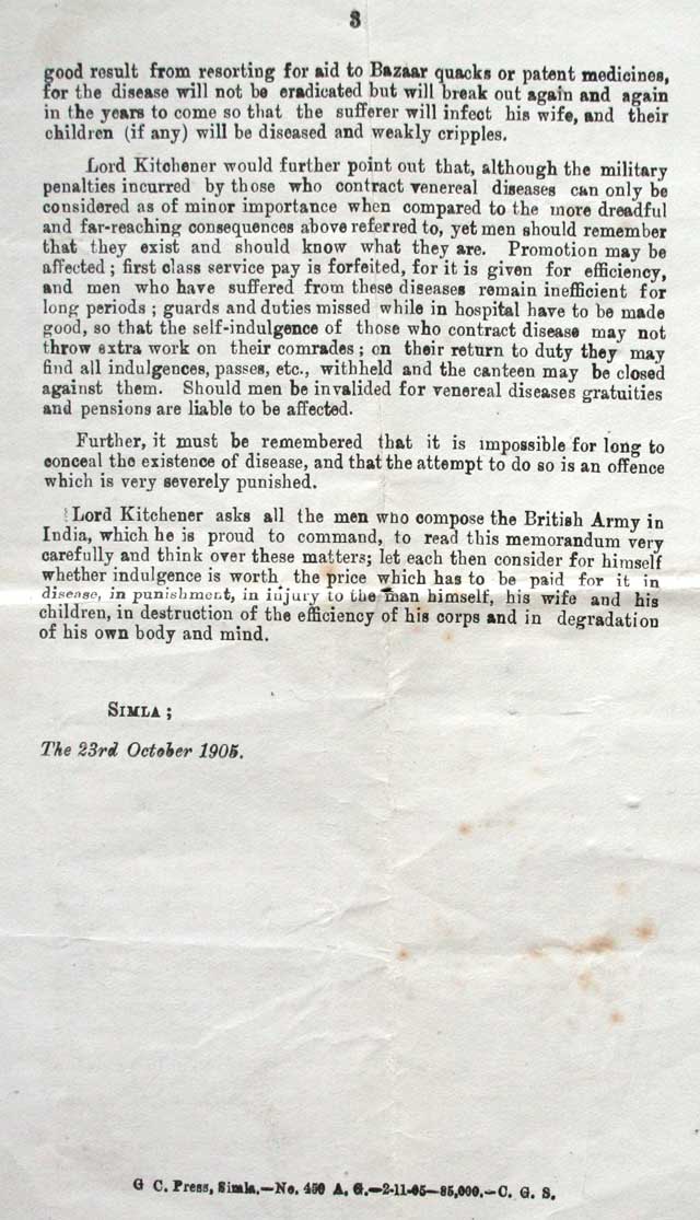 Collections - Archives Memorandum by His Excellency General Viscount Kitchener of Khartoum, Commanding in Chief in India, concerning Venereal Disease among British Troops. Dated 23rd October 1905.
