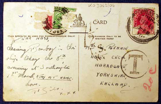 Postmarked 8 Feb 1938, ‘Bombay’ addressed to Mrs W Rennie, in Harrogate.